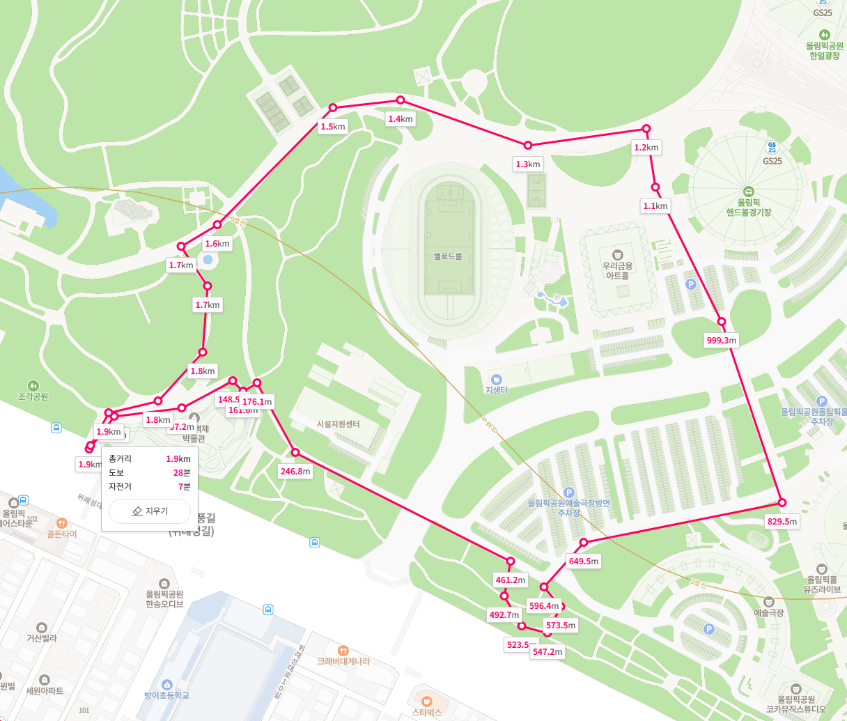 한성백제 박물관 옆에 셋길로 올라감