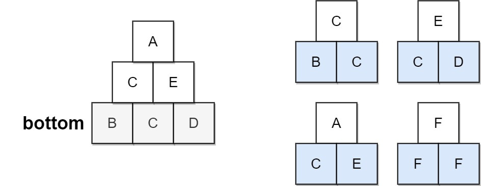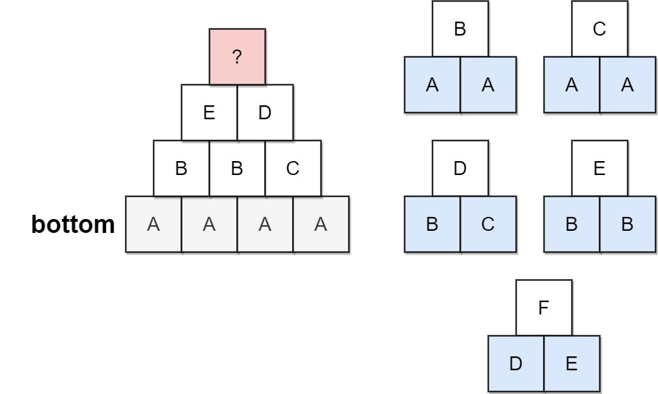 피라미드를 미적으로 아름답게 만들기 위해 허용되는 특정한 '삼각형 패턴'이 정해져 있습니다. 삼각형 패턴은 두 개의 블록 위에 하나의 블록을 쌓는 방식입니다. 이 패턴들은 allowed라는 세 글자 문자열 리스트로 제공되는데, 처음 두 글자는 각각 아래층의 왼쪽과 오른쪽 블록을 나타내고, 세 번째 글자는 그 위에 쌓이는 블록을 나타냅니다.